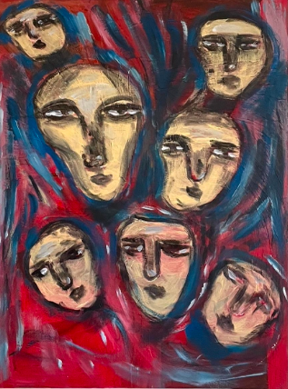 Fatma Sharawy explores the quiet weight of melancholy not as a single emotion, but as a spectrum of inner states that sit just beneath the surface. Each face reflects a different version of sadness: resignation, reflection, longing, or quiet endurance. Painted in her expressive, layered style, the painting captures how deeply personal emotions often feel shared, even in silence. It’s a portrait of emotional complexity where sorrow isn’t loud or dramatic, but soft, still, and deeply human.